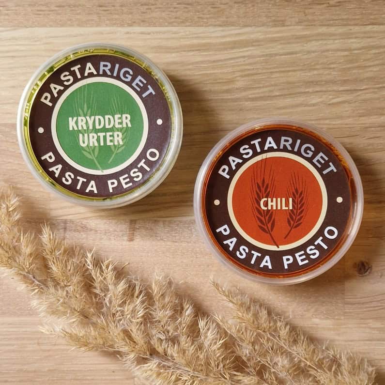 Pasta Pesto fra PastaRiget er en bøtte med bornholmsk rapsolie tilsat smag. En bøtte Pasta Pesto passer til en pakke gourmet pasta (4 portioner).