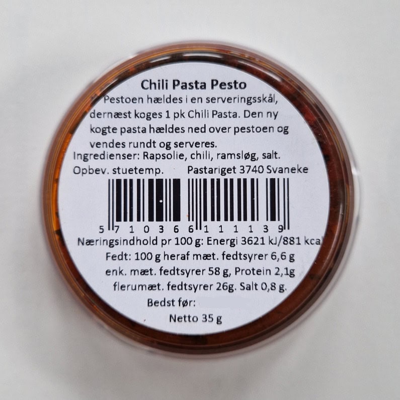Pasta Pesto Chili: Bornholmsk rapsolie, piri piri chili, frysetørret ramsløg, havsalt.